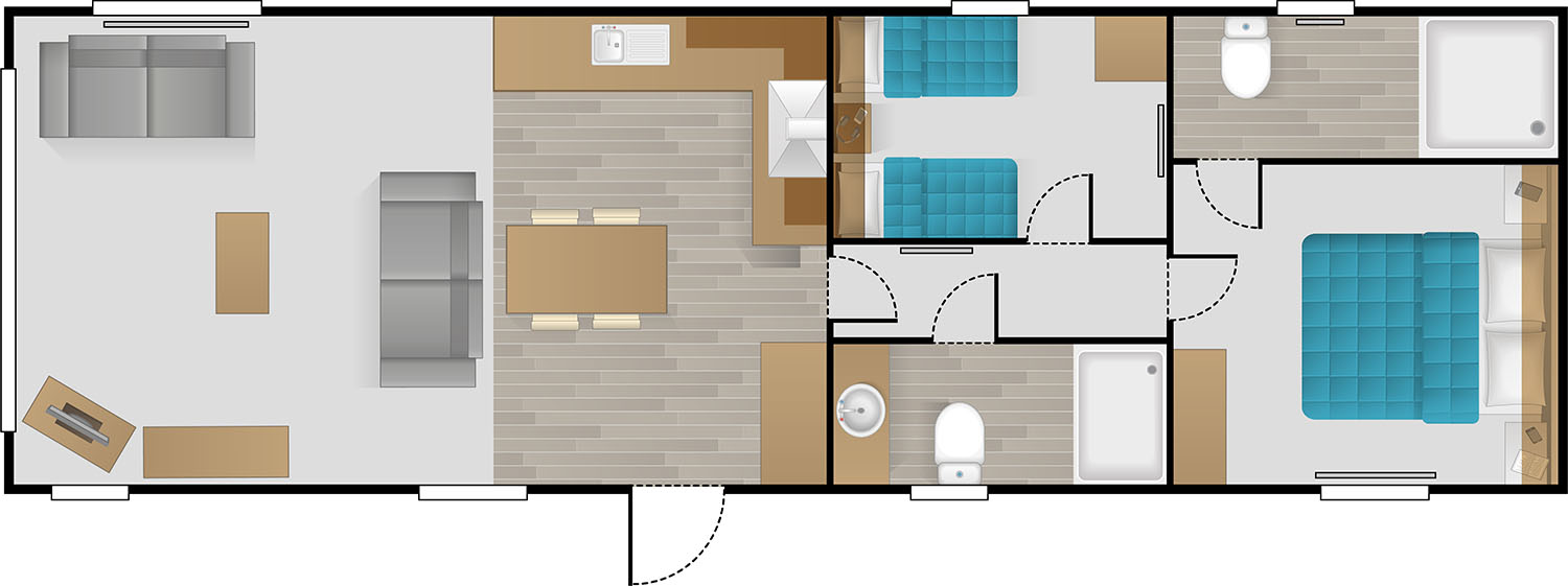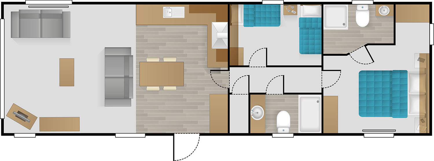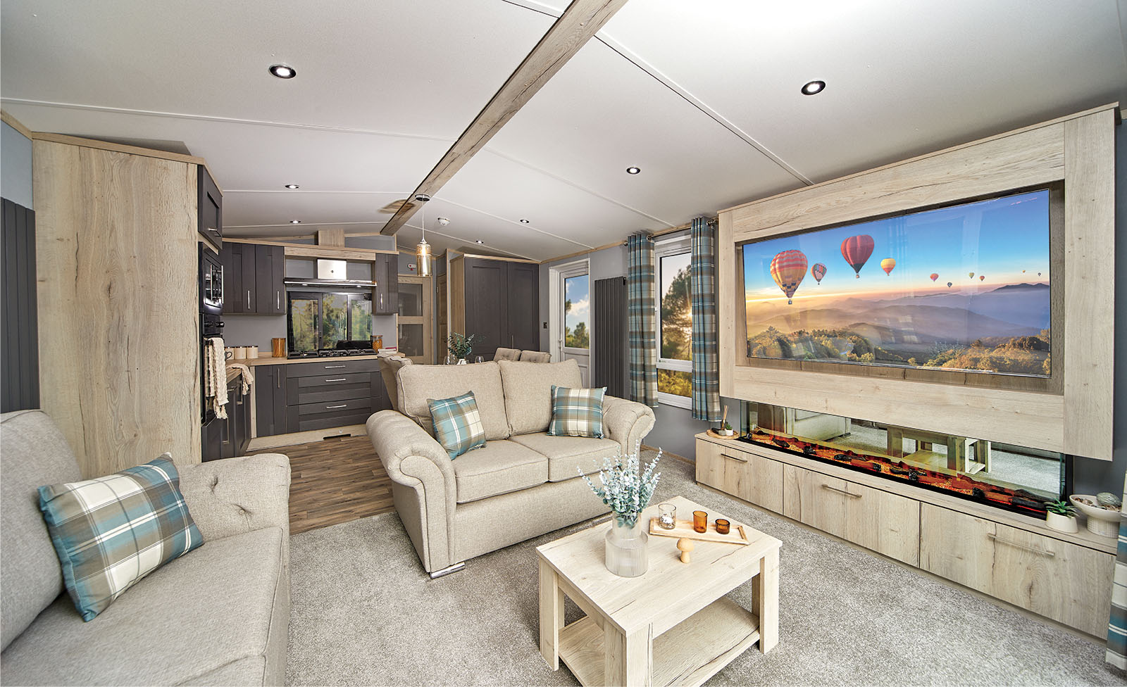 Meal times are a breeze in the Whinfell's well equipped kitchen, featuring a gas hob with overhead extractor, fan oven and microwave all surrounded by light oak timber accents and warm grey fronted doors. Guests are kept comfortable with button backed, cushioned dining chairs.